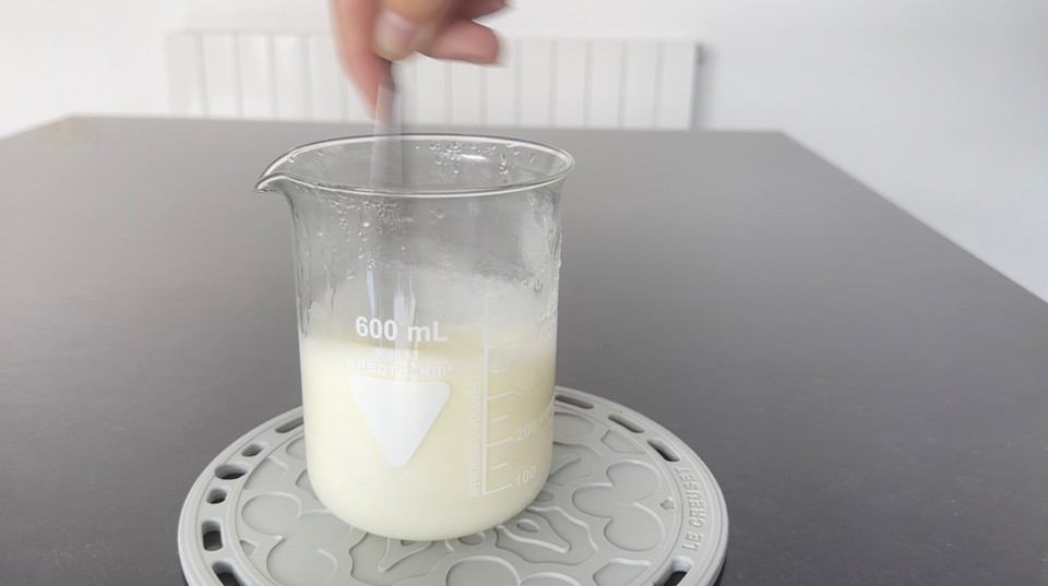 - Combine the oil phase with the water phase. Use an immersion blender (or a homogenizer) to combine.