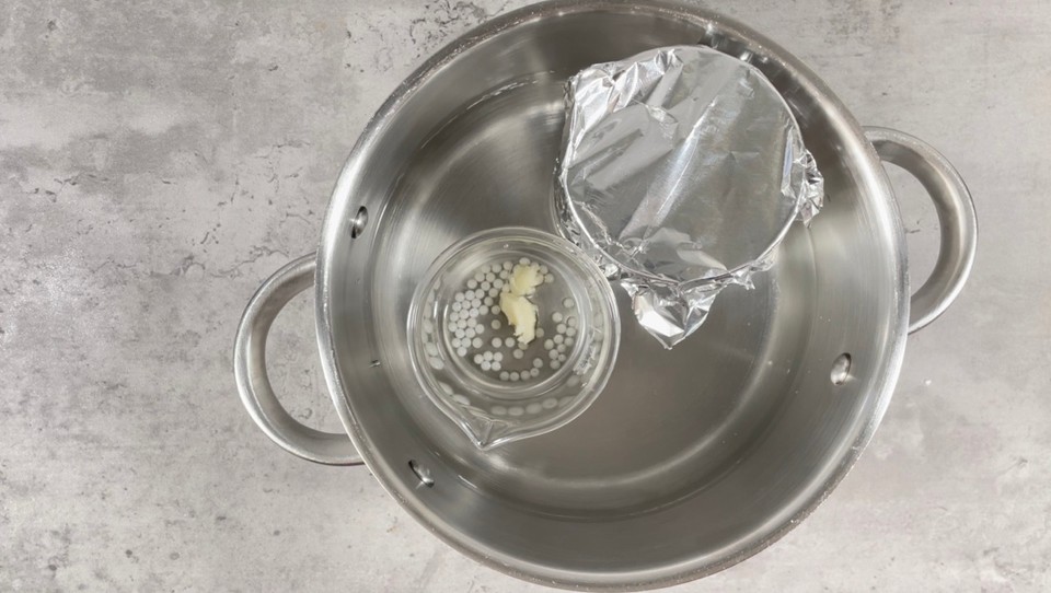Once we prepare the oil phase and the water phase, we will place them into a double boiler for the oil phase to melt.