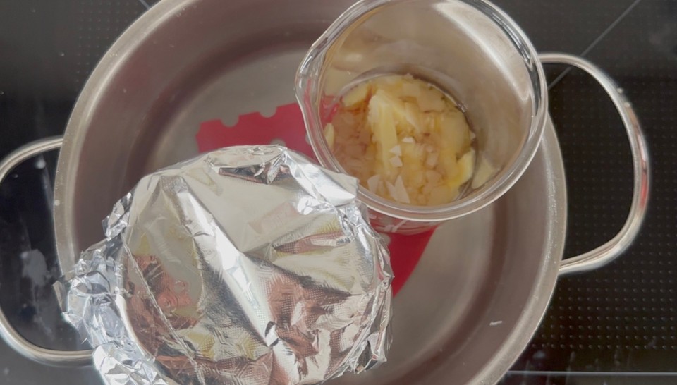 - Place the oil and water phases into a double boiler on medium heat (for 25 minutes) to melt the oil phase. Cover the water phase beaker with aluminum foil to minimize water evaporation. (when working with bigger batches, you should scale your water phase before heating and after removing it from the heat. Calculate the water evaporated during the heating and add the missing amount to the water phase beaker).