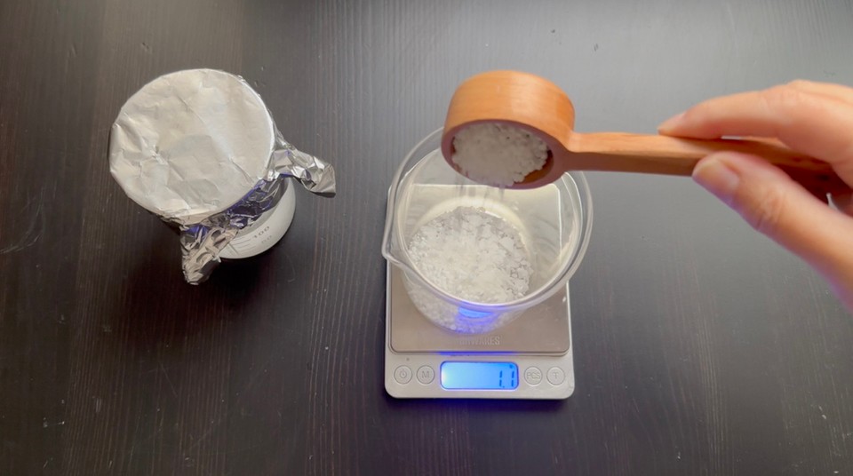 - In a heat-resistant beaker, add the water phase ingredients. Start with the distilled water, then add the allantoin. Cover the water phase beaker with aluminum foil to minimize water evaporation (when working with bigger batches, you should scale your water phase before heating and after removing it from the heat. Calculate the water evaporated during the heating and add the missing amount to the water phase beaker).