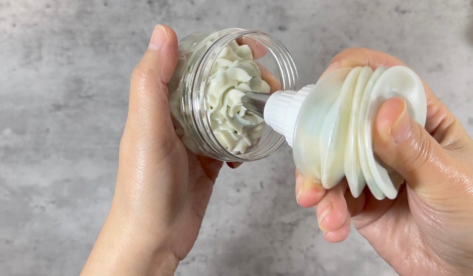 - You can pipe the emulsified body butter. I used a reusable squeeze bottle. I filled it with the two colors and piped it into a container.