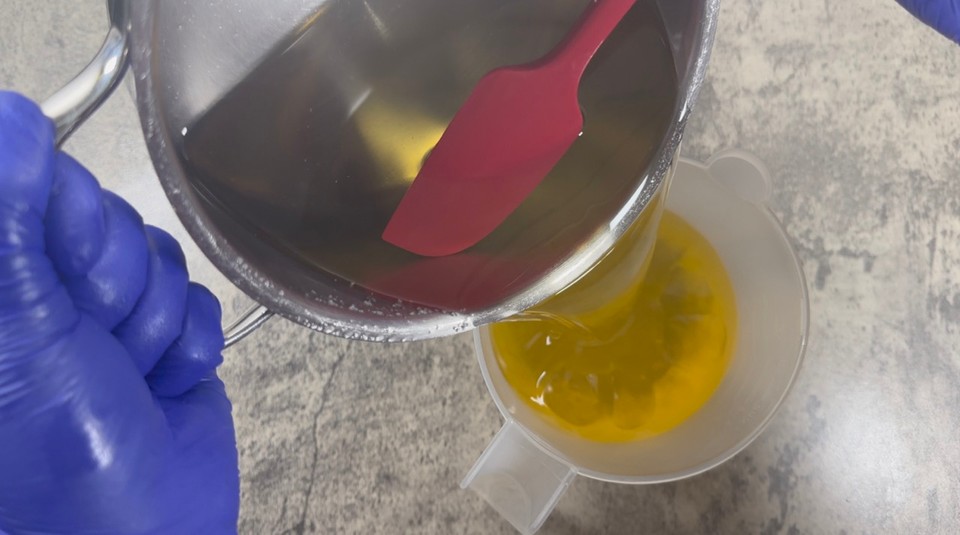 - Pour the lye solution into the oils, and use an immersion blender to emulsify. Add the essential oils and blend for a few more seconds.