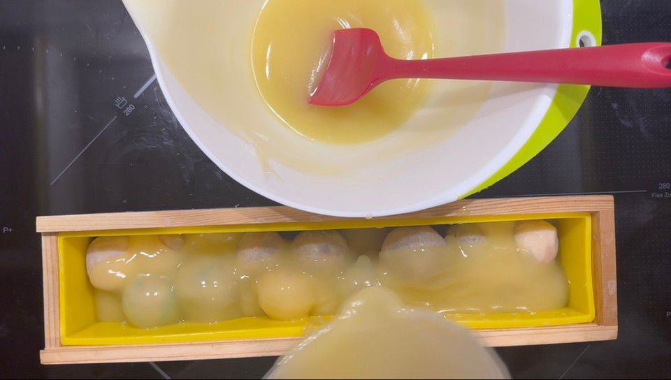 - Prepare the second layer of batter (add the essential oils) and pour it on the soap balls. Tap to release air bubbles.